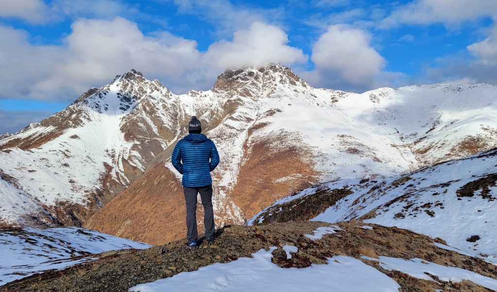 With another morning of sunny skies, we drove to Eklutna Lake to hike the Twin Peaks Trail, with the promise of some of the most stunning alpine views in the area. The official trail only goes about 2.5 miles, and, though it gains 1800 feet of elevation, is a great family-friendly option that will provide you with a beautiful vantage point to the lake and out to the surrounding mountains. To extend your hike, continue along the trail another 2+ miles of climbing, and you’ll reach an expansive ridge with jaw-dropping views of the lake to the east, with towering Gold Star Peak to your back. The final stretches of trail can be a little challenging, especially in the snow. We had to step gingerly in several places, as a slip could lead to a long tumble down the mountain. Microspikes and poles are also a helpful addition.