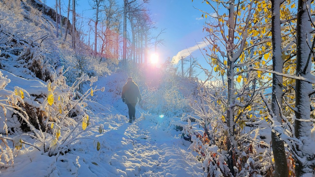 The following morning greeted us with an even greater blanket of snow, but the promise of tapering showers. As the sun broke through, we headed to the McHugh trailhead along the Seward Highway, and hiked south along the Turnagain Arm trail, which gave us stunning water and mountain views, deep, fresh powder on trail, and striking yellow foliage emerging as the snow melted in the warming sun.