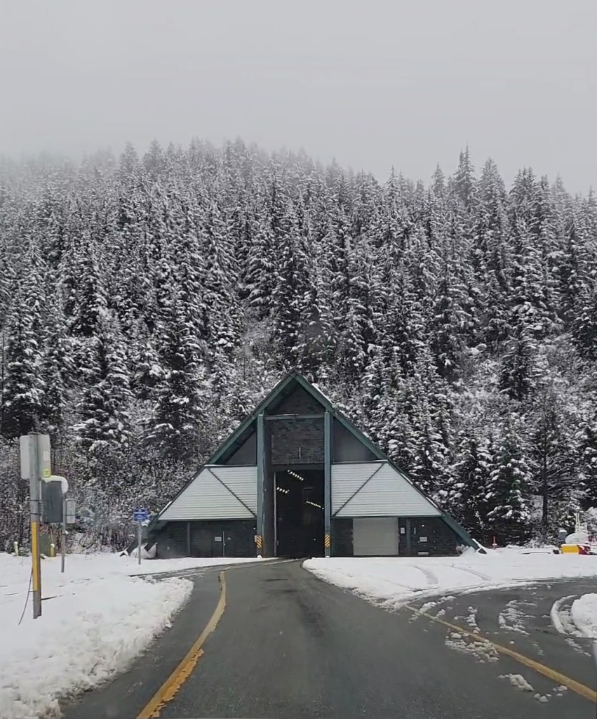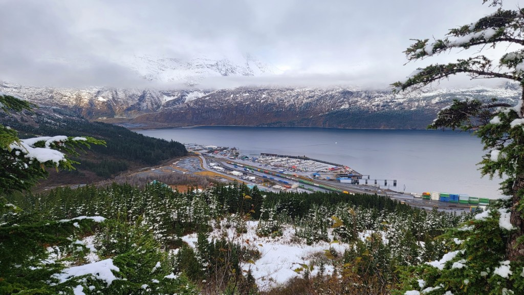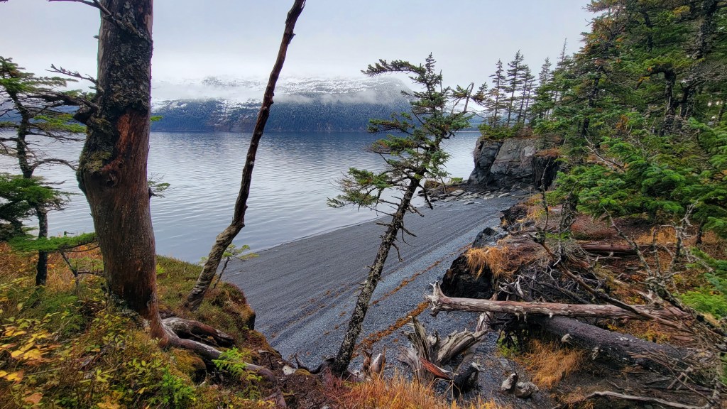 Back on the road, we drove south and east to the tiny port town of Whittier. With a clear route blocked by towering mountains, reaching Whittier requires a drive through the 2.5-mile long Anton Anderson Memorial Tunnel, the longest highway tunnel in North America. At just over one lane wide, the tunnel allows one direction of travel at a time, scheduled on the half hour. Even crazier still, the travel lane shares space with railroad tracks, allowing daily freight rail service to and from the port. Whittier itself nearly closes up once the summer cruise and travel season is finished, so we crammed into the Lazy Otter Cafe with the handful of locals and travelers in town, for coffee and sandwiches overlooking the nearly empty harbor. After eating, we hit the Blackstone Bay Vista Trail to take in views of the town from a snowy landing a little over a mile up the hill. Finally, we sought out a secret beach along the Shotgun Cove Trail, where we found seclusion, gentle waves and endless piles of rocks to skip before our return drive.