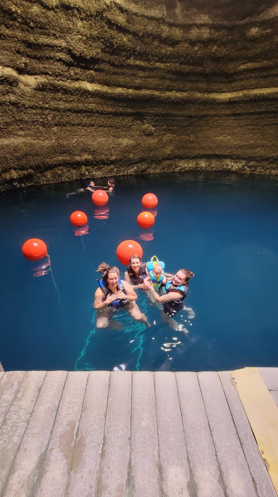 Beyond the soothing temperature, the water is crystal-clear, making it popular for both snorkeling and diving (fun fact: Homestead Crater is the only warm-source scuba destination in the continental US). Most guests tend to stick with bobbing around the surface, and a handful of reservable spaces are available every hour. All ages are welcome, and with the provisions of life jackets for all guests, the water depth is much less of a concern. Still, for those not crazy about free-floating above 10+ fathoms of blue expanse, there are two in-water decks complete with a rail and benches, providing a perfect spot to sit back and relax, or to hang out with a little swimmer, as I did for much of our visit. After your swim, be sure to take the stairs up the southern flank of the cone to check out the view from the top…both to the surrounding hills and down into the crater itself!