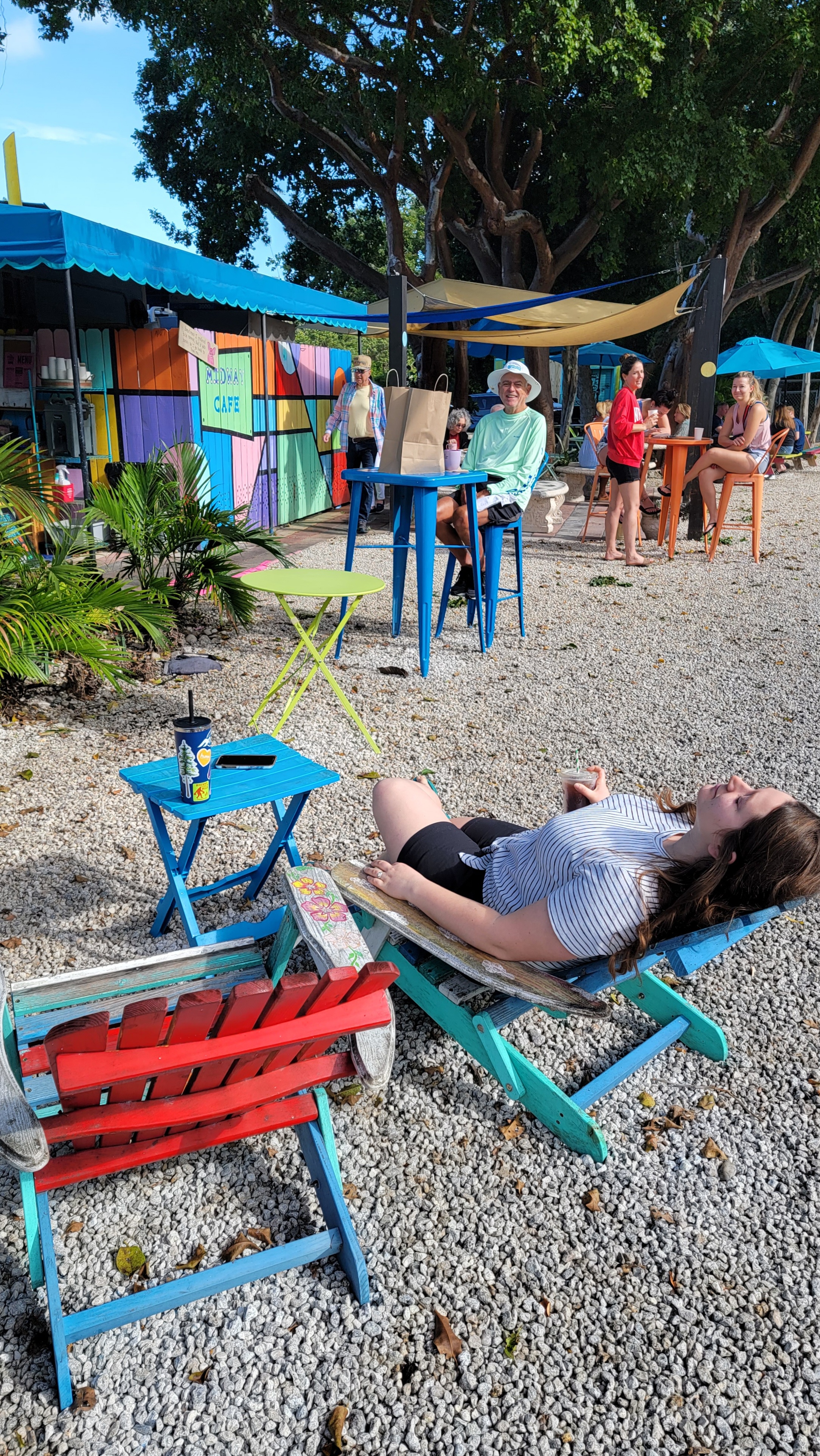 After this welcome slowdown to truly introduce us to island life, we lucked out and found a short line at Midway Cafe & Coffee Bar a few minutes farther along in Islamorada. Breakfasts are simple but satiating here…you can’t go wrong with Everyone’s Favorite Sandwich, a cinnamon roll and a poppyseed muffin, paired with an iced coffee. Kick back in the eclectic outdoor seating, where you’re likely to encounter more locals than tourists. As Kjirsti sunbathed in a well-worn adirondack chair, we conversed with a longtime local who escaped Cuba during his teen years. Donning a light cyan Columbia PFG performance long sleeve, running shorts and a white bucket hat, he regaled us with the histories and changes of the neighborhood, and let us in on some of his closely guarded secret places to stop.