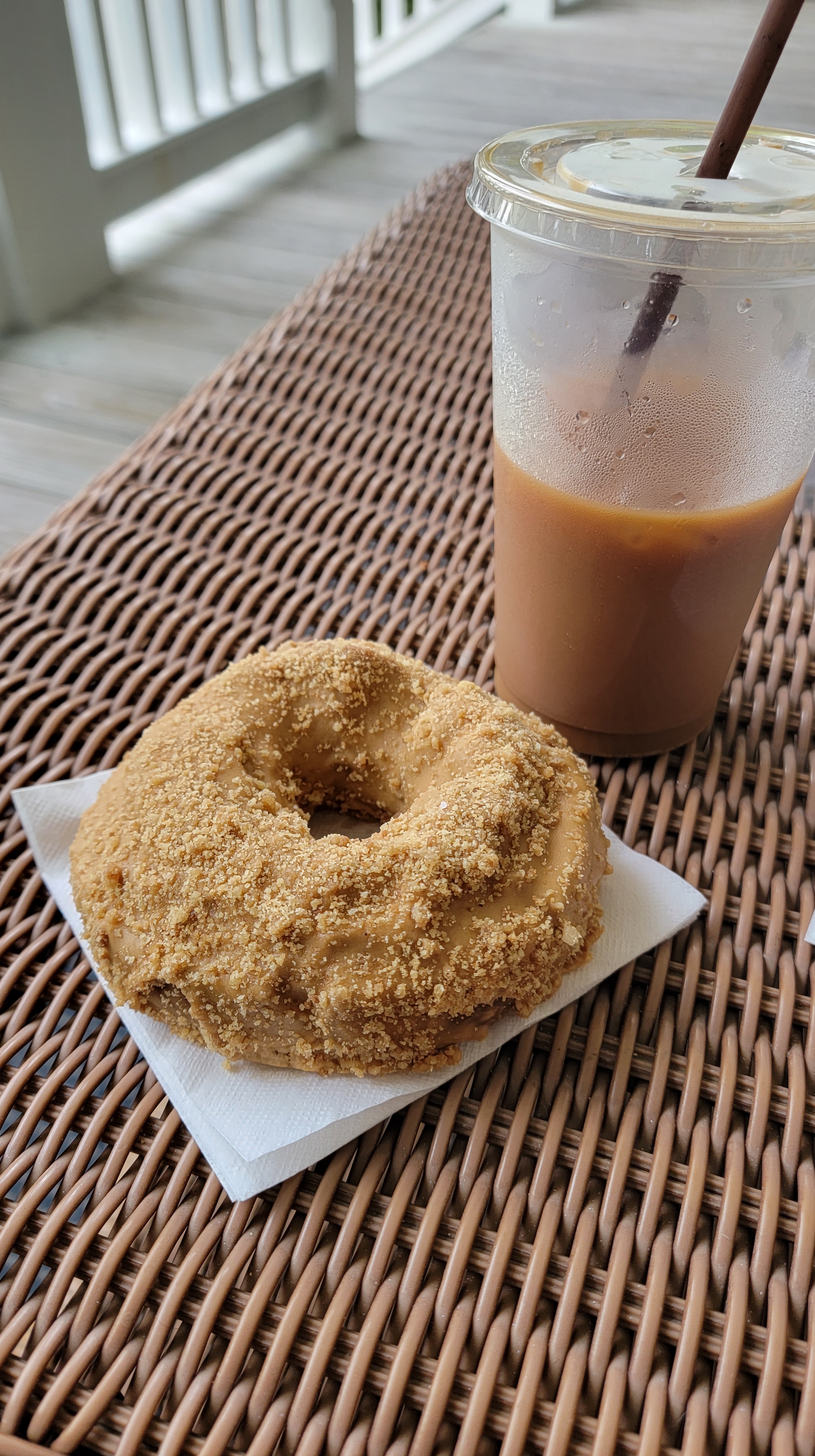 We had a quiet night in our spacious room, followed by a simple breakfast on the front porch as the sun rose and (some of) the town shook off their slumber. Since this was still during Covid, breakfast was limited to individually wrapped items, but still featured egg and pastry options, fruit and accompaniments such as yogurt and juice. Just 3 addresses to the east, we followed up with a stop by Glazed Donuts, home to numerous incredible donut options including Guava Jelly, Meyer Lemon Pistachio and Maple Bourbon with Candied Bacon, along with house roasted coffee and (proudly) paintings of giant robots. Leaving the robots on the walls, we took our coffee and donuts back to the porch and were the sudden envy of the other guests who had begun to venture outside. After a quick stop at the Mile 0 marker for an obligatory selfie, we were on the road and headed north.