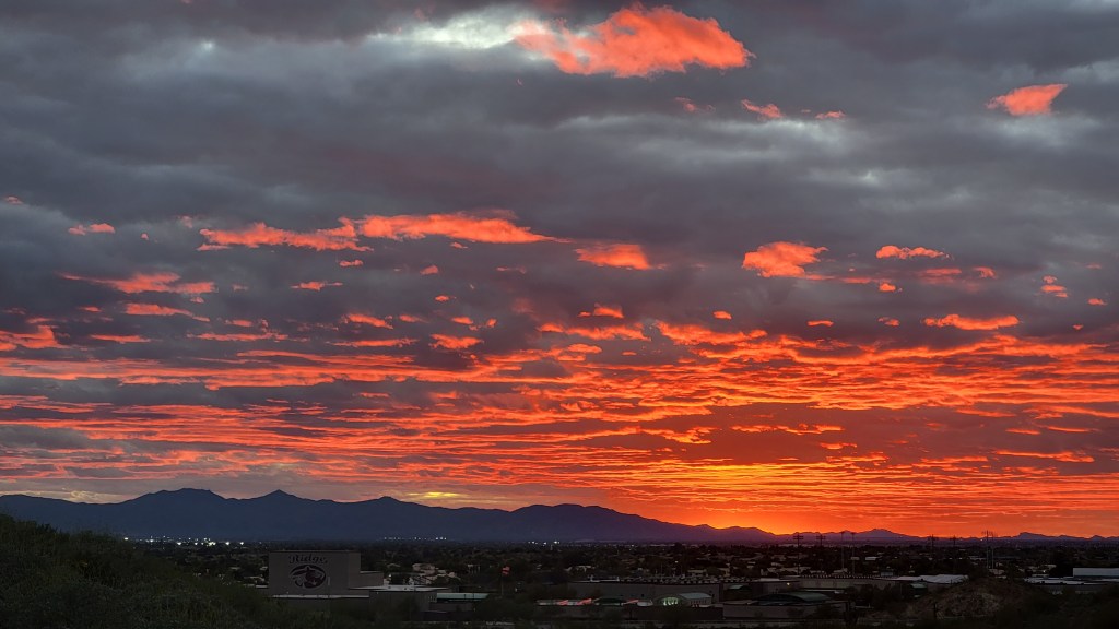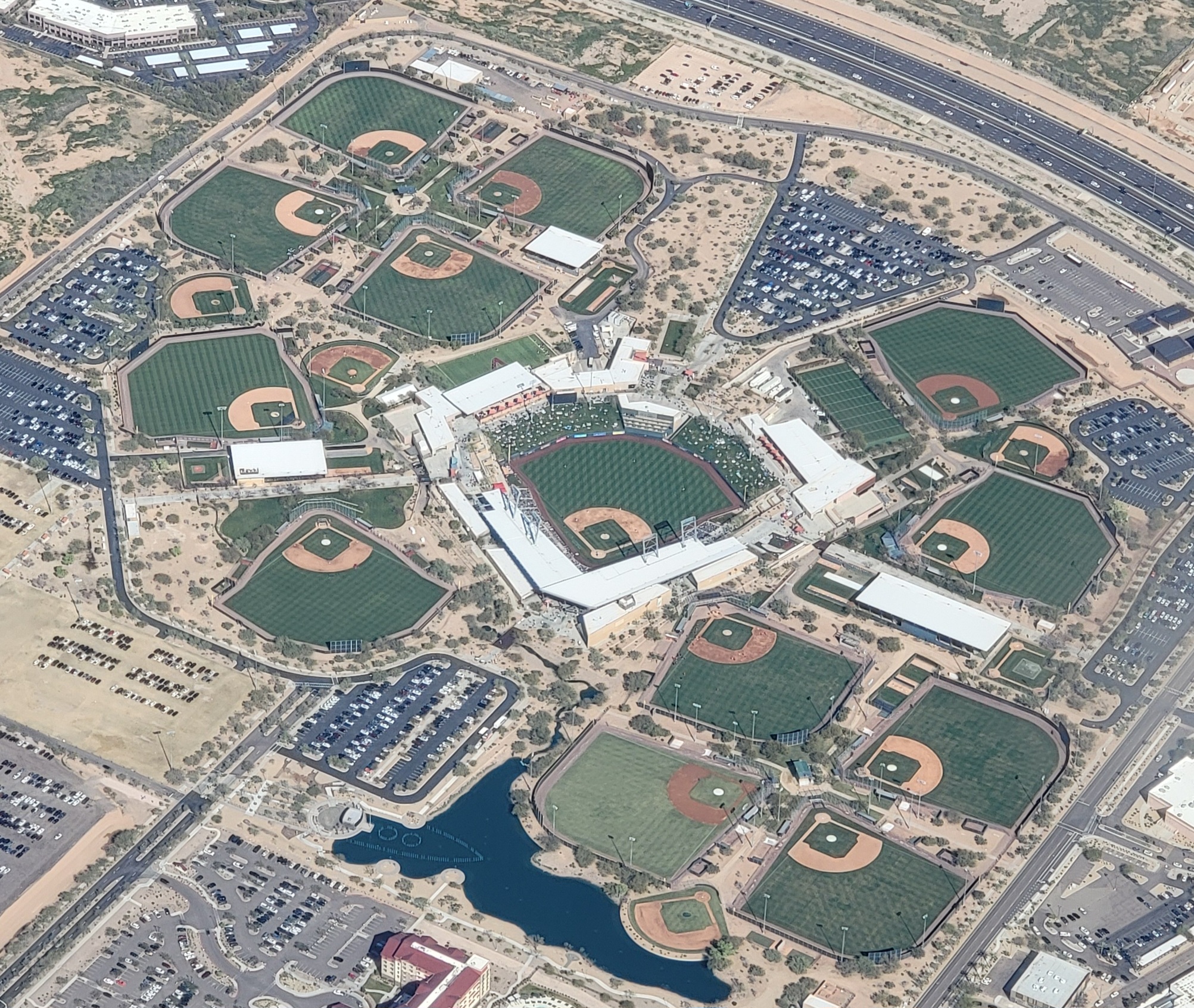 The blanket of clouds below thinned out as we passed over Nevada, and soon we were treated to glimpses of the Grand Canyon out the left window. Beginning our descent, the snow-capped Four Peaks stood proudly in the distance, and we could next identify the Superstition Mountains east of Apache Junction. Getting lower to the ground, one stadium complex after another rolled along below us. At Sloan Park, Spring home of the Chicago Cubs, fans were sprawled across the outfield lawn seating as a game was in progress.