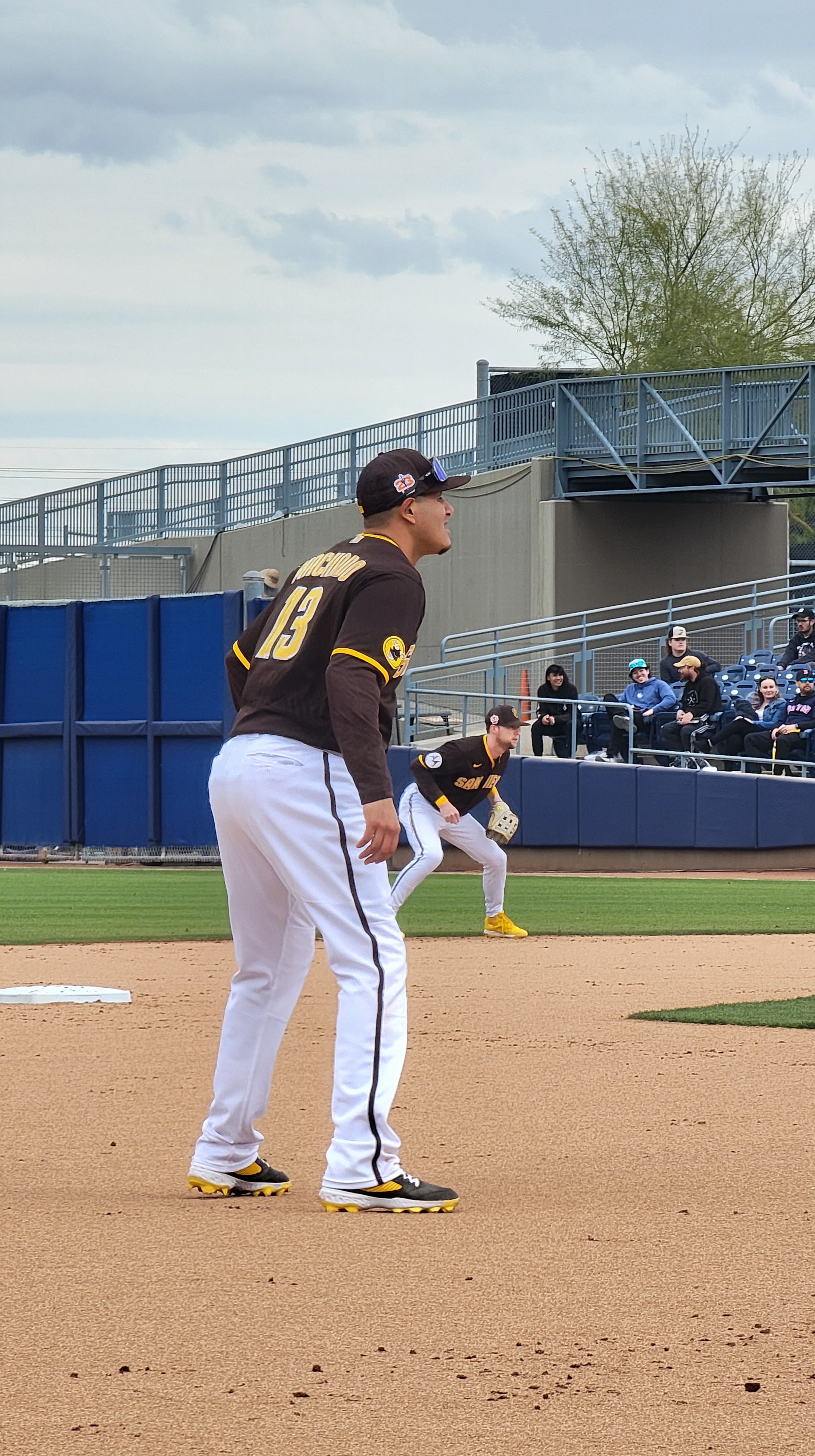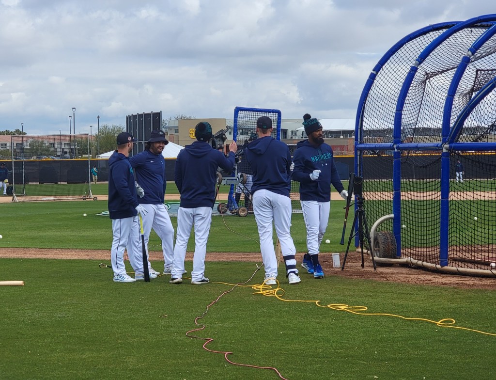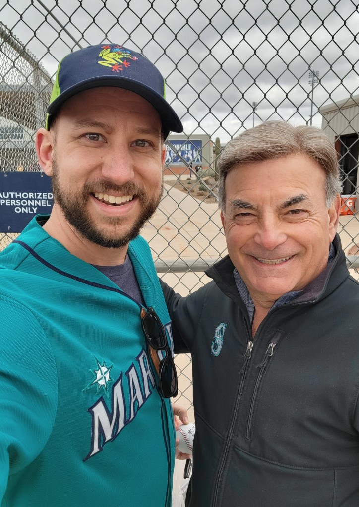 As the players all got to practicing, we wandered from field to field, snapping photos of some of our favorite current and former players, and chatting with other fans along the way. Staying attentive, I spotted both commentator Rick Rizzs and general manager Jerry Dipoto wandering through the crowd, who each obliged when I asked for a photo with them. Recently-drafted catcher Harry Ford also milled about, and a few up-to-date fans noticed him and were able to talk with him awhile.