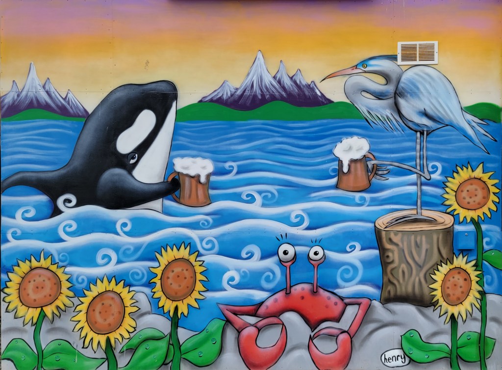 When the day is wrapping up, Tapped Camano pours a variety of local beer and cider favorites, paired with an excellent fried chicken sandwich or fish & chips, not to mention the loaded tots with Beecher’s cheese. Also featured here is a quirky, locally-inspired mural by offbeat Seattle artist Henry.