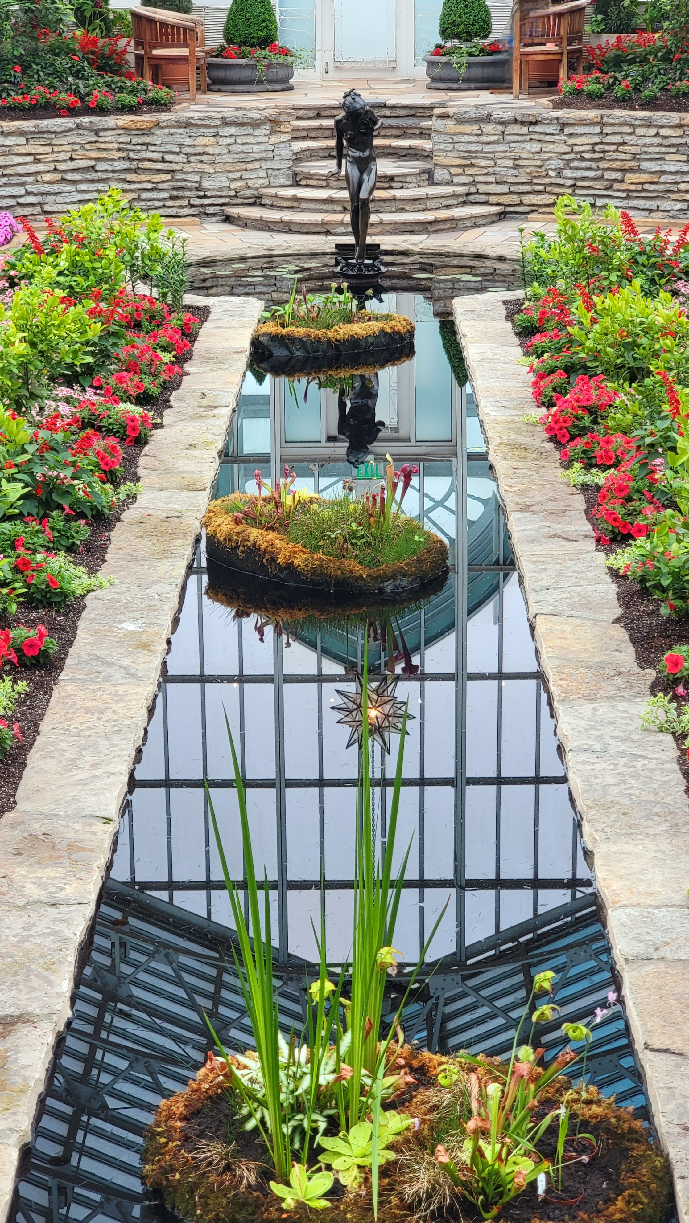 To the south of the dome, the real showstopper took my breath away, as we entered the unbelievable Sunken Garden, with a narrow reflecting pool, flanked by fire-red salvia and dwarf citrus trees. Paths on either side were lined with hot pink petunia and crimson snapdragon. Arching panes of glass met at the top of the structure, looking like some cross of a royal English greenhouse and a stately historic train station. The far end of the pool featured a small statue of a woman tiptoeing through the lily pads.