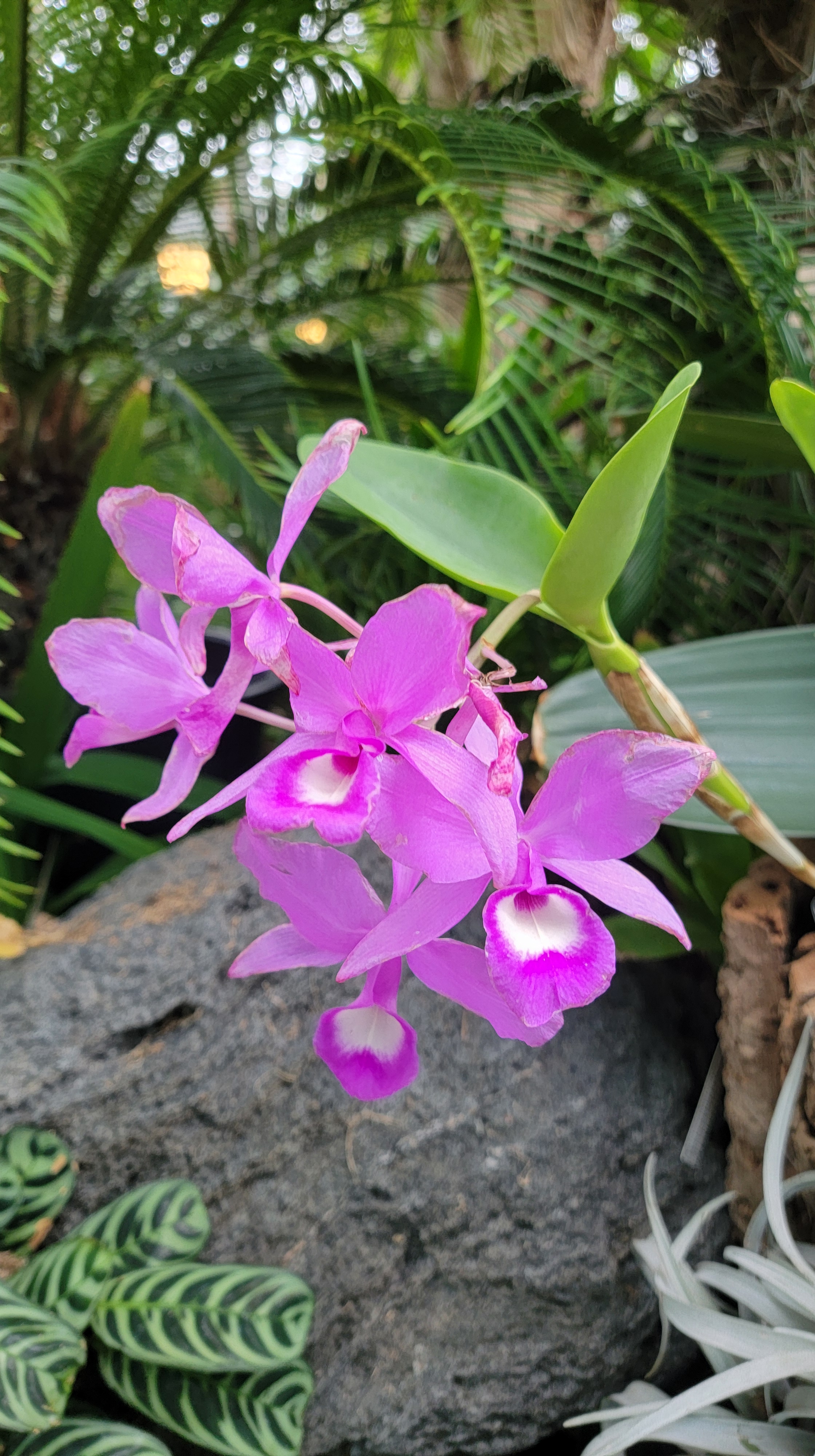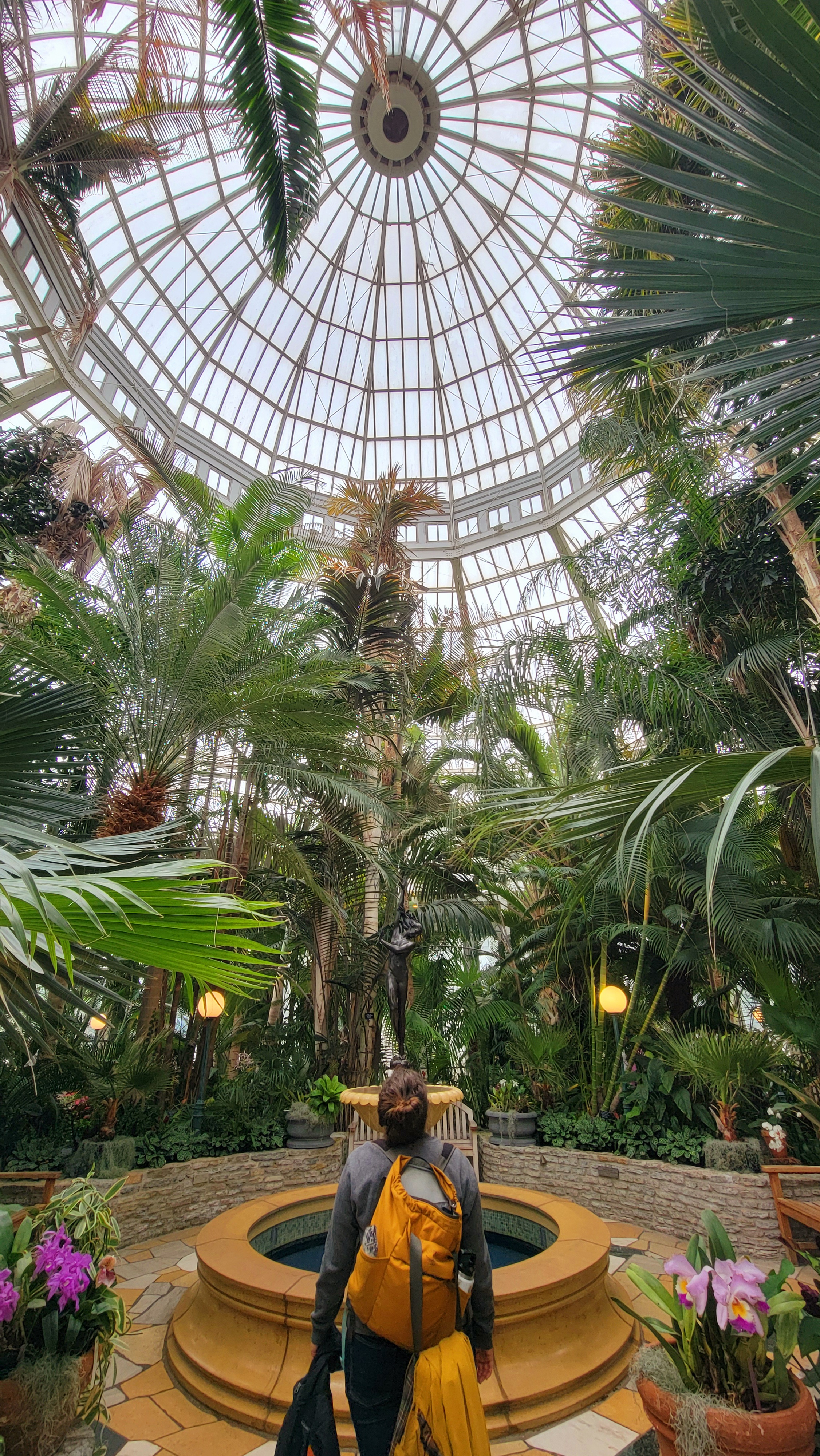 Tearing myself away from the hypnotizing sea of green, we next entered the Palm Dome, with a towering glass ceiling and beautiful palm varieties craning toward the top. Along the ground spread a carpet of orchids, bromeliads and oversized versions of the little houseplants I try to please at home. Sporadic benches invited us to sit and gaze, but our energetic little one kept enthusiastically pointing out different plants around the dome.