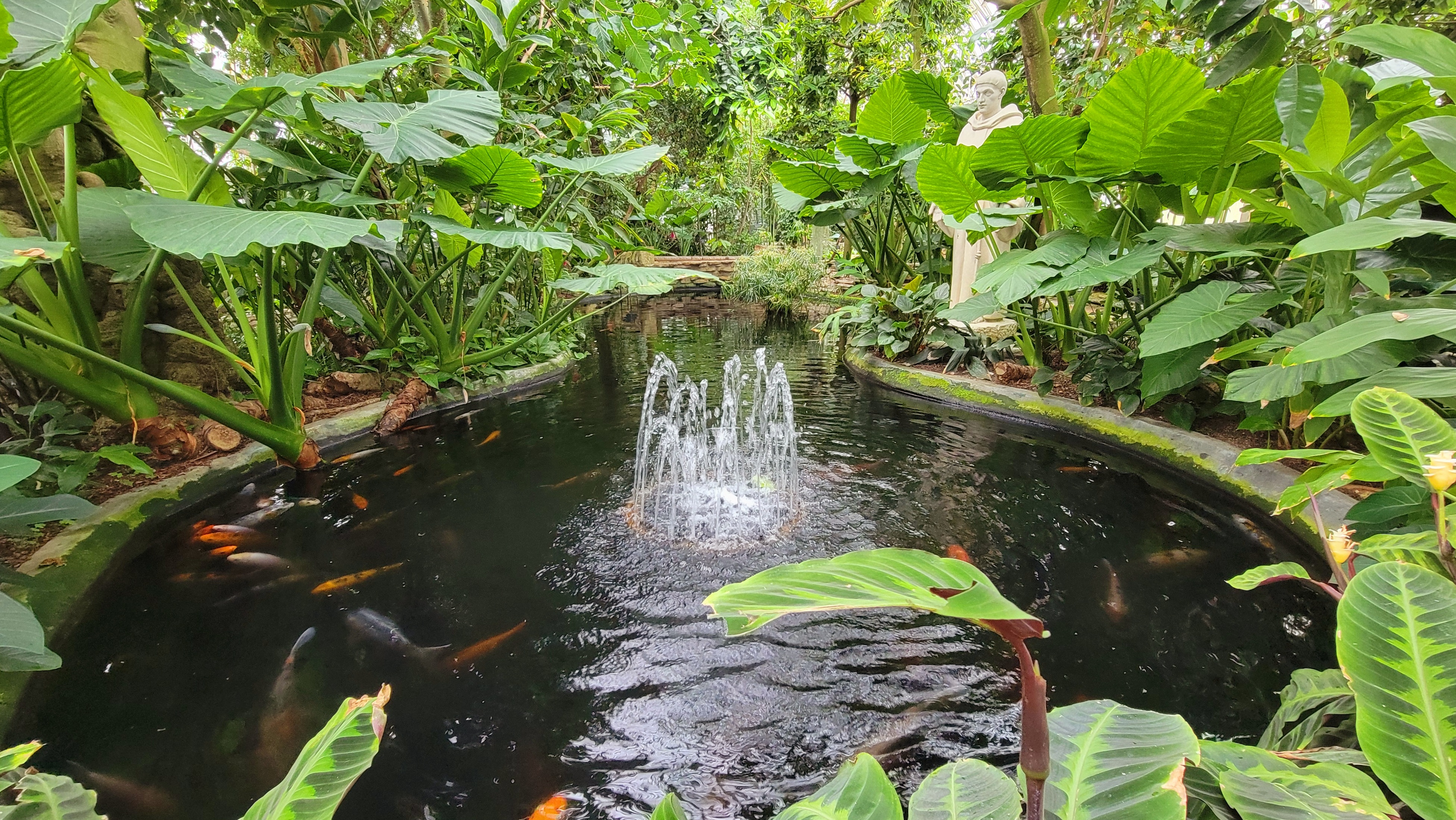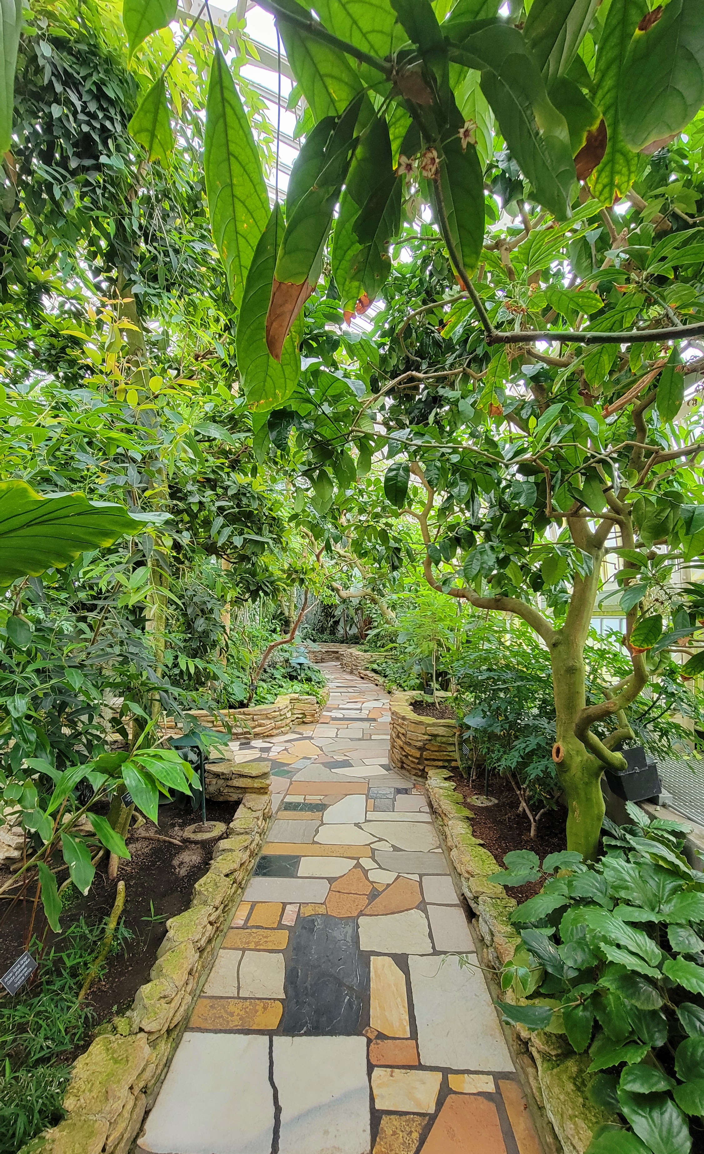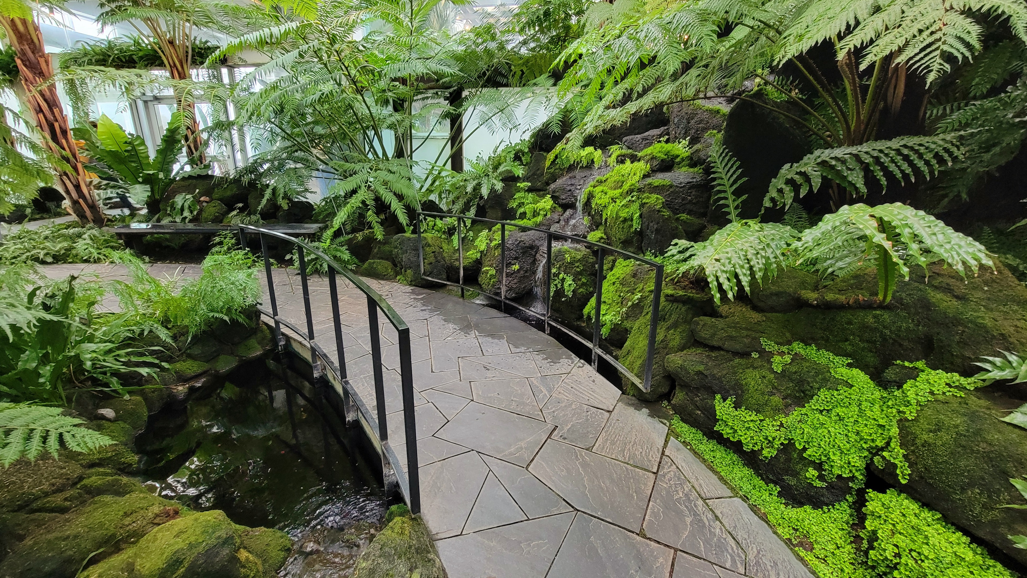 With glimpses of green beyond the glass, I reached for the door and pulled it open. I was swaddled in a warm, humid blanket of air, and smelled the sweet and pungent aroma of earth and flora. Ahead lay a jungle of leaves. Though not through a wardrobe, it was as if I had suddenly been transported to some tropical Narnia. As I gazed up at the canopy of fronds stretching above my head, my little one toddled along behind excitedly, squealing with delight as he pointed at a cascading flow of water passing maidenhair ferns.