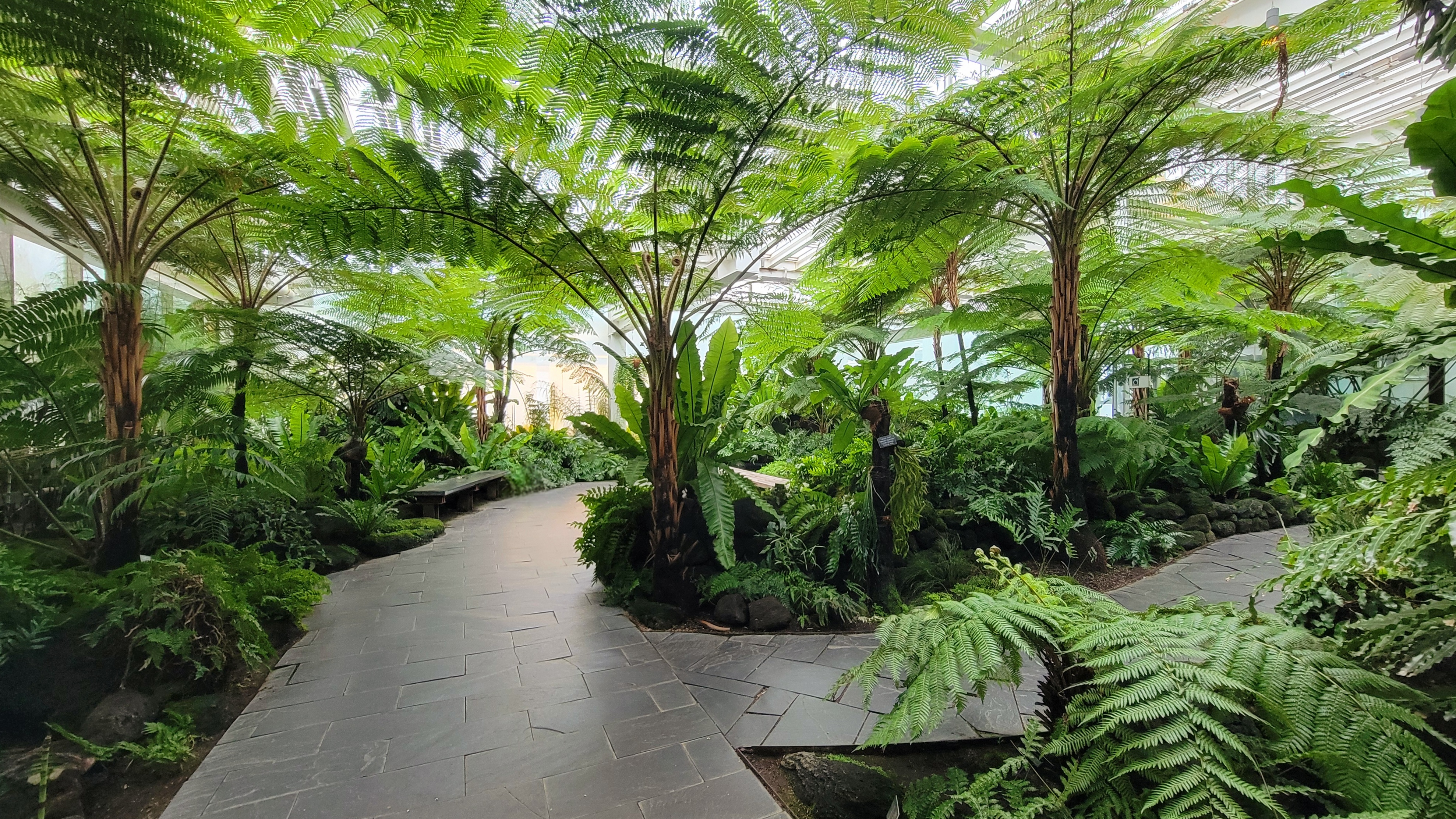In the Fern Room, I was taken aback by what I initially thought to be palm trees, but realized were 12-foot tall ferns with trunks the size of my arm and fiddleheads that looked like a giant green cinnamon rolls perched atop their stems. Horsetail taller than the artichoke plant in my garden lurked beyond a bounty of ferns I had never before seen, and aquatic plants graced the top of a small water garden.