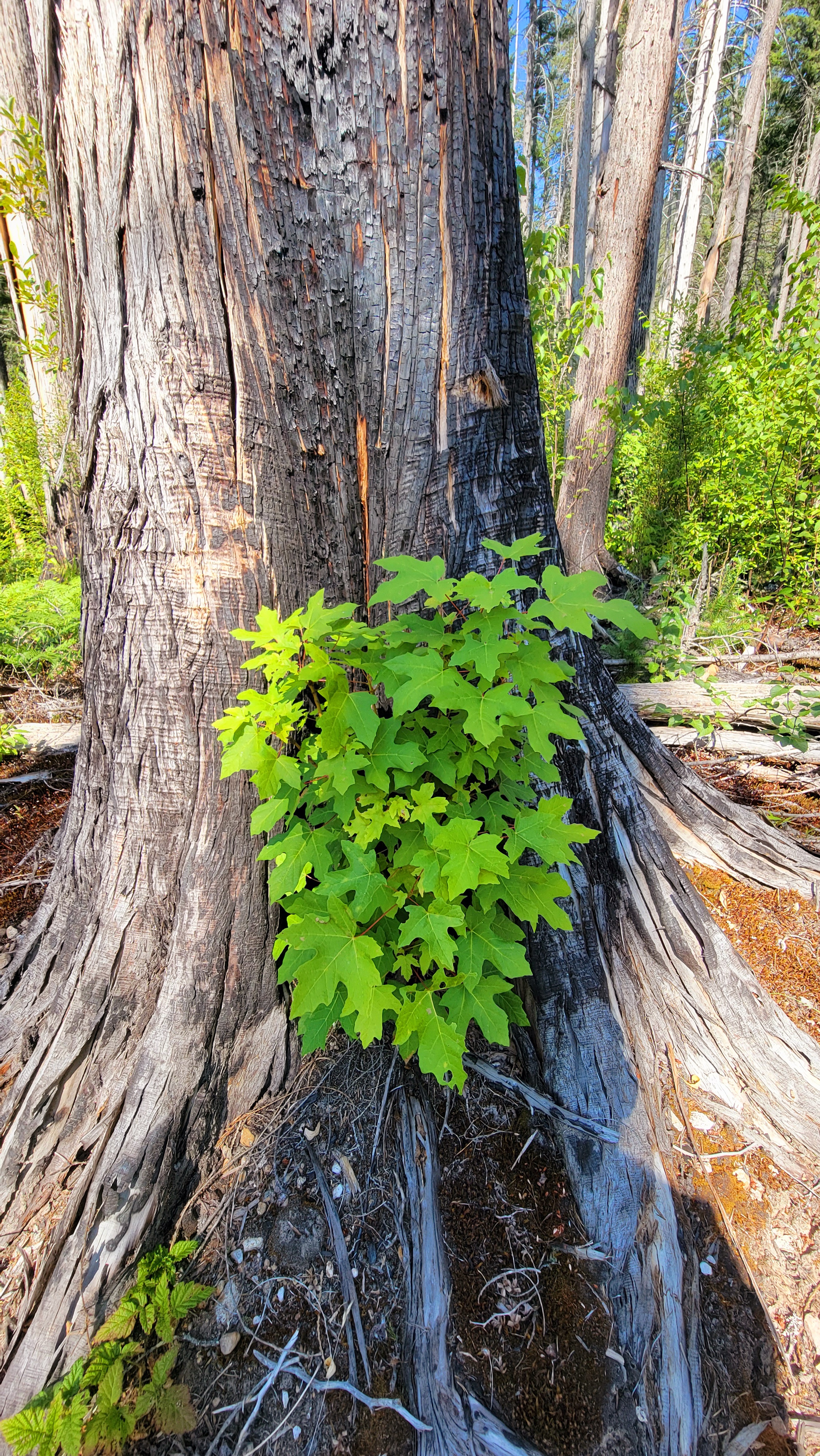 Fast-forward to 2024. Now in the 9th growing season after the fire, the landscape does not look much different at first glance. The hillsides still host hundreds of skeleton trees, looming over the highway and the town, remnants of woodland sentinels, now reduced to nothing more than a blackened memory. With the iconic PNW forestland look erased from the landscape, the hills provide a lasting reminder of the devastation of the fire. But peer a little closer, and notice the shades of green carpeting the forest floor. Pull off the highway, get out of your vehicle, and closely examine your surroundings. Before you, take in 9 years of growth, healing and recovery, 100% the efforts of nature, unassisted by man. Life. Hope restored.