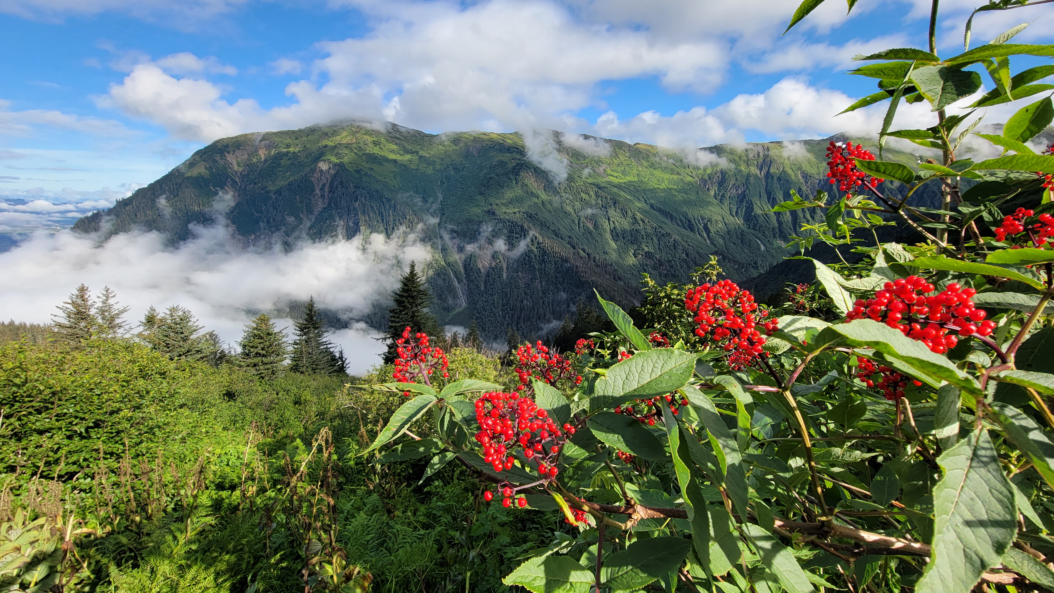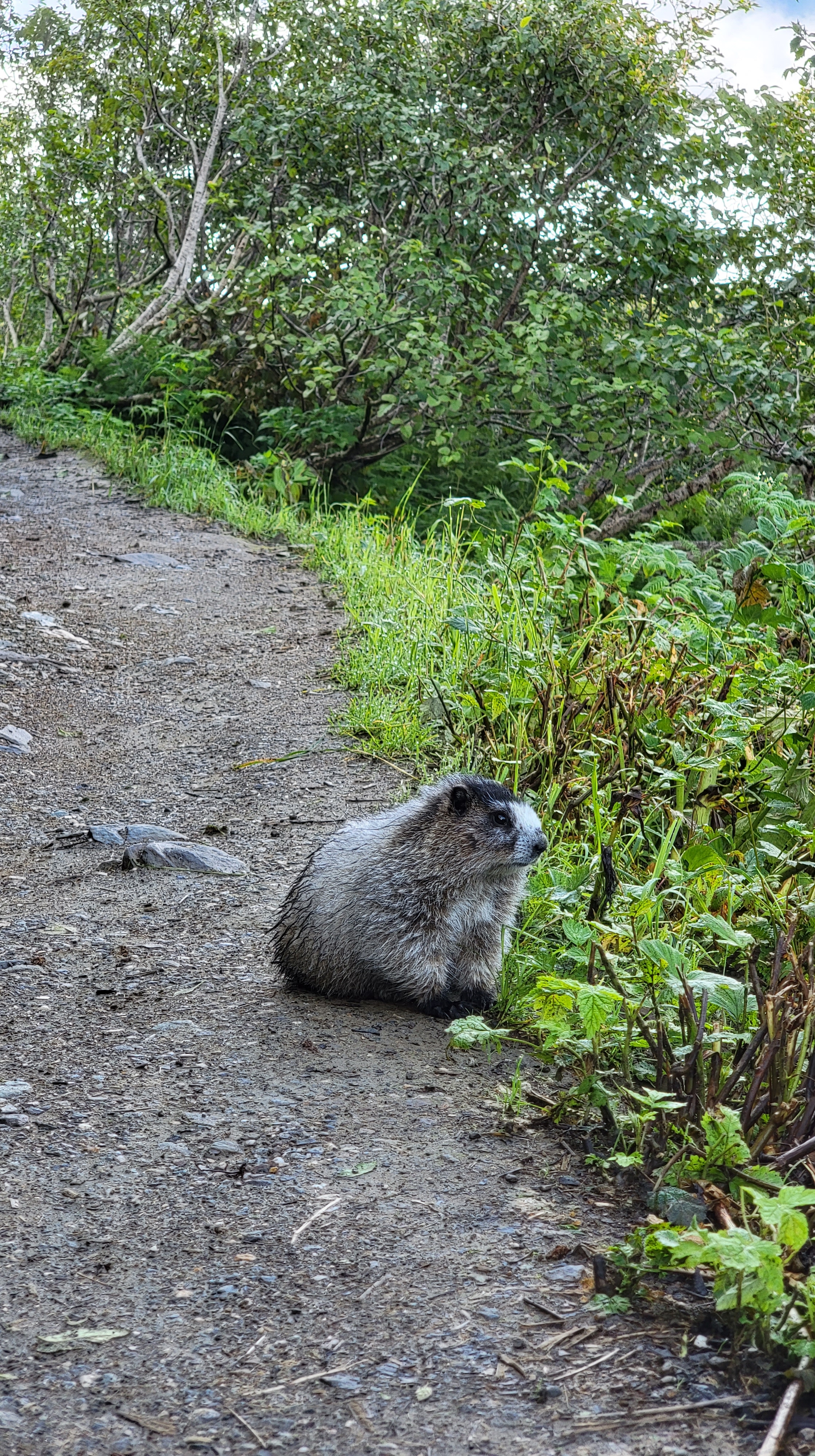 At the top, we spent the next several hours on the upper portion of the Mt. Roberts Trail, with some of the most incredible views I’ve experienced on a hike. In the first section straight out the tram station, vantage points at 2,000’ up offer sweeping views both directions down Gastineau Channel. Higher still, and as the trail turns farther inland, enjoy absolutely mesmerizing alpine views along the slopes of Roberts Peak, with miles of valleys, snowfields, waterfalls and trees. Along our hike, we were treated to several rotund marmots sunning themselves (forget “Fat Bear Week,” I want “Thicc Marmot Week”), grouse rushing about, and a family of mountain goats sauntering away in the distance. No word if any of the marmots were named Alan or Steve. We hiked a total of 4.6 miles with 1653′ feet of elevation gain over the course of about 3 hours.