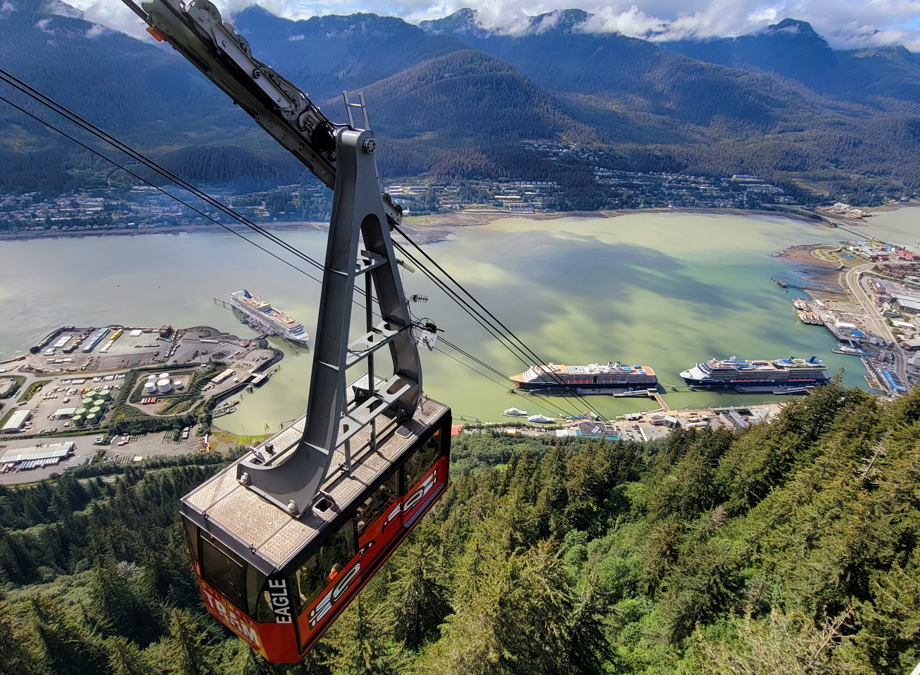 Initially discouraged by fog obscuring the top, and warily eyeing the trickle of cruisers walking the gangway, we scored a 60-passenger tram all to ourselves as the fog began to break, leading to a stunning motion-picture experience out the back window of the ships and harbor rapidly fading below as we climbed. Climbing 1,800 feet in 6 minutes, the tram leads to a restaurant, theater and store, plus trail access points and viewpoints. A little pricey, the Goldbelt Tram is now accessible only via an all-day, unlimited ride pass that runs $55 for adults and $40 for children ages 3-12.