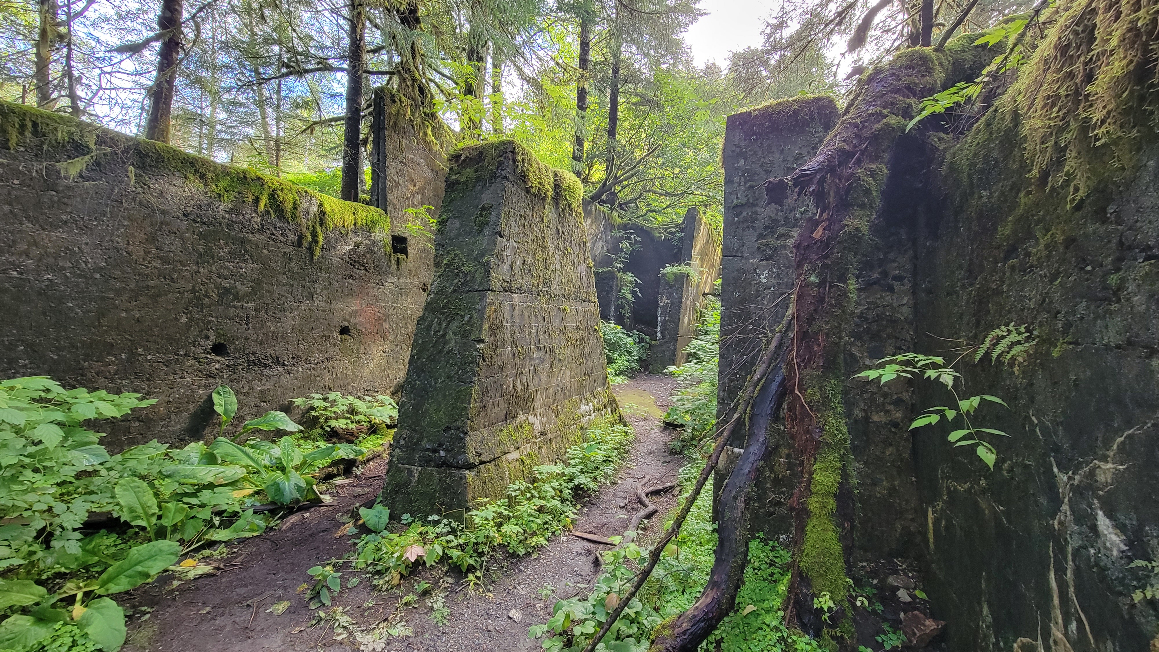 With a few hours left until sundown, we hopped the bus across Gastineau Channel to wander the Treadwell Mine Ruins, with numerous mining relics and building remnants from what was at one time the largest hard rock gold mine in the world, extracting over 3 million troy ounces of gold between 1881 and 1922. Today, visitors can walk where streets once stretched, now marked by a handful of interpretive signs.