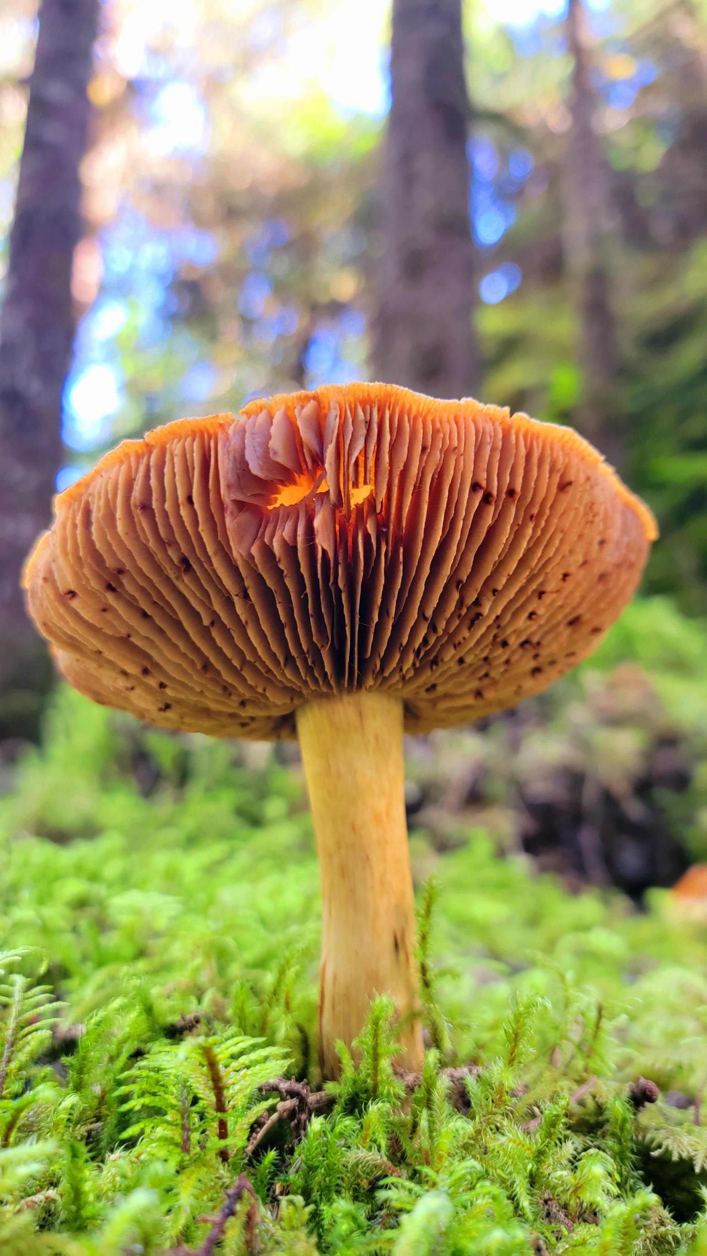 On our final morning, after a quick and simple cafe breakfast near the airport, we rode the bus as far as we could toward the Mendenhall Glacier Visitor Center, covering the final 1.5 mile stretch of road on foot, which allowed me to recreate the iconic scene from The Office in which Michael Scott and the others run toward a radar speed sign. My top speed of 16mph may have bested Dwight Schrute’s 13, but I still fell a bit short of the arterial speed limit. Arriving by 9:30 a.m., we had once again beaten the majority of the cruise ship crowds, and spent the next 2 hours wandering the trails, admiring the glacier, perusing the visitor center and snapping a great waterfall photo for our Christmas card near the base of Nugget Falls. The Trail of Time provided a beautiful array of fungi enjoying the aftermath of summer rains, while the boardwalk along Steep Creek offered great viewing areas of vibrant red spawning salmon, plus a porcupine asleep in a tree.