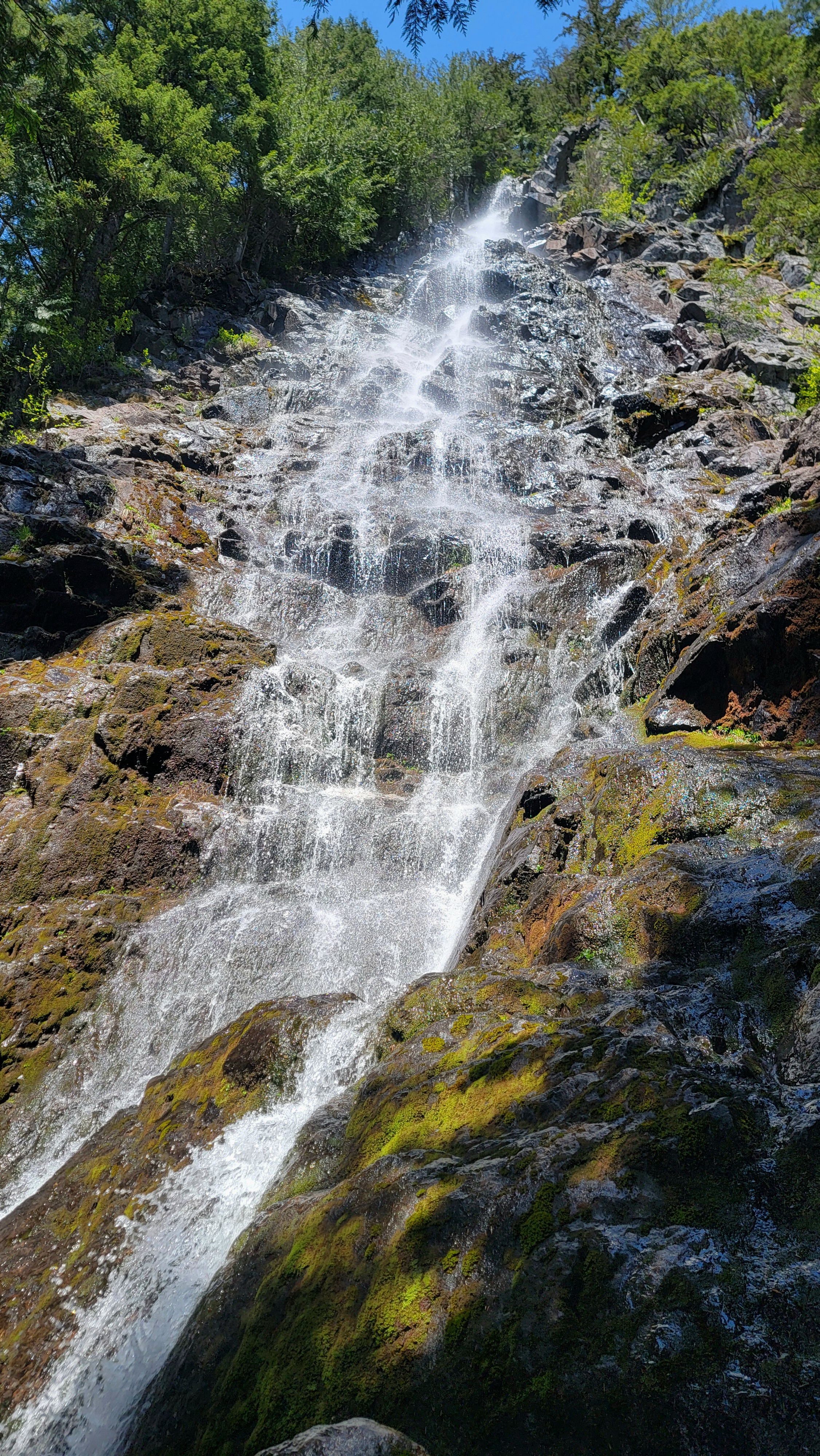 After 20 more switchbacks, and a short scramble, we reach the end of the trail at the base of the falls. Unfortunately, though we knew the overlook was small and didn’t have a lot of room for many people, we were surprised and disappointed to see that it was all steep and rocky with a sharp drop-off and no level areas for sitting with kids. Kjirsti keeps Bunty strapped to her front, and Walter is able to sit on a rock directly next to her as I stand and try to stay out of the way of other hikers as we have a snack.